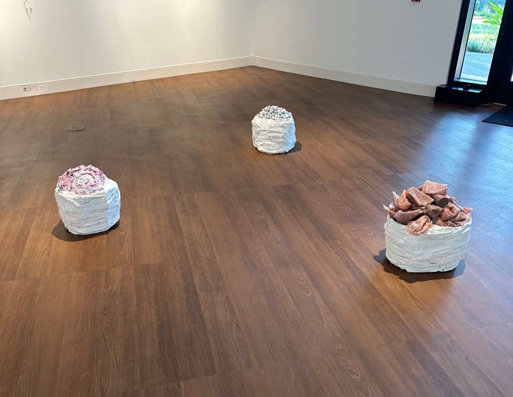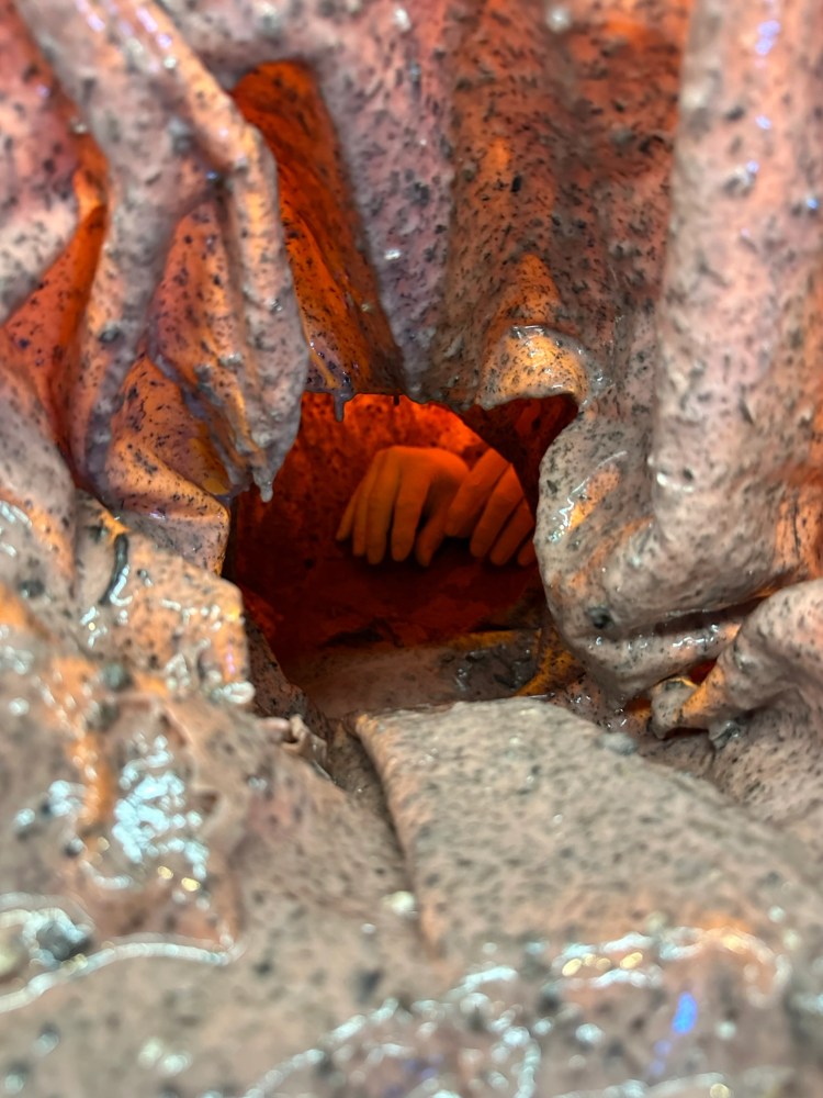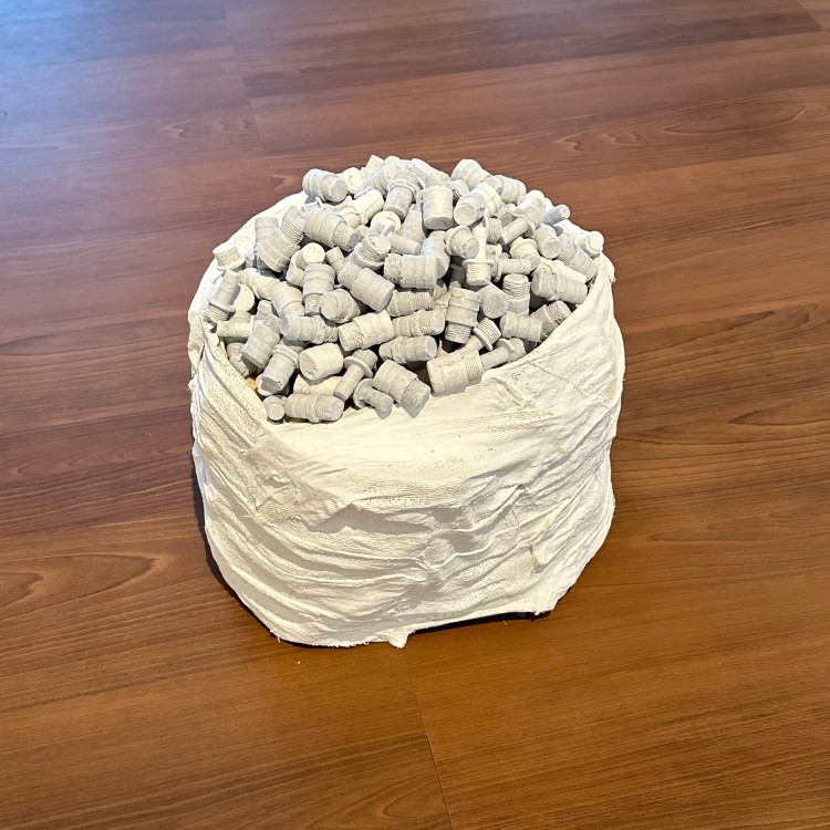 Collect Your Things and Leave, 2023, Diapers, Hydro-stone, Plaster Bandages, Silicone, Dirt, Sugar 30″ x 65″ x 24″