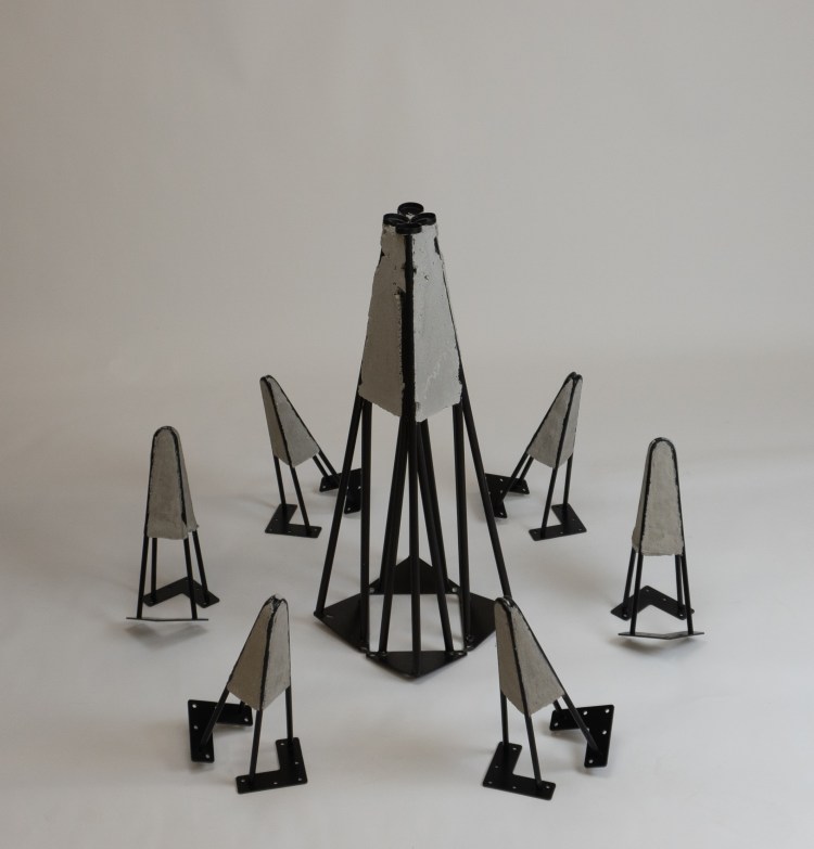 A Leg to Stand On, 2024, hair-pin table legs, cement, 28 1/8″ x 37″ x 37″