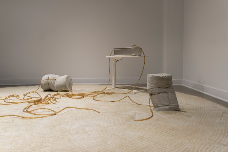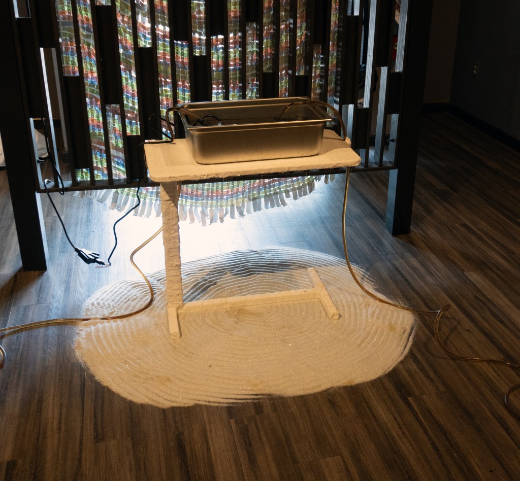 Regurgitating Poison, 2024, (Gainesville, FL Iteration), Demolished Glass, Concrete, Hospital Bed Tray, Plaster Bandages, Kitchen Prep Pan, 3/4″ Clear Tubing, Pump, Vodka, Diet Coke, 48″ x 180″ x 180″.