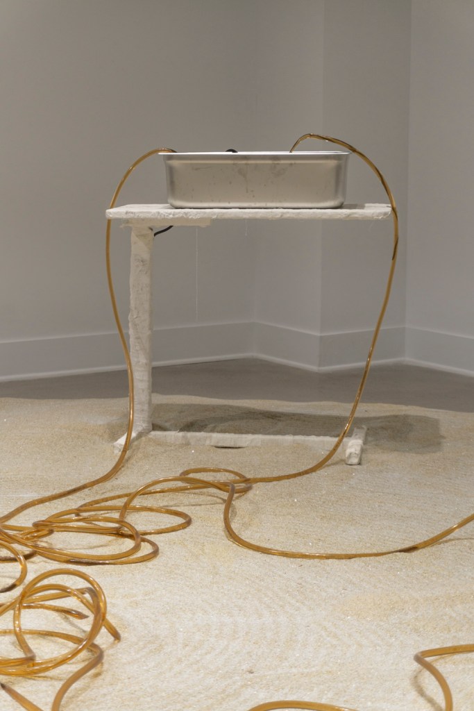 Regurgitating Poison, 2024, (UCF gallery iteration), Demolished Glass, Concrete, Hospital Bed Tray, Plaster Bandages, Kitchen Prep Pan, 3/4″ Clear Tubing, Pump, Vodka, Diet Coke, 48″ x 180″ x 180″.