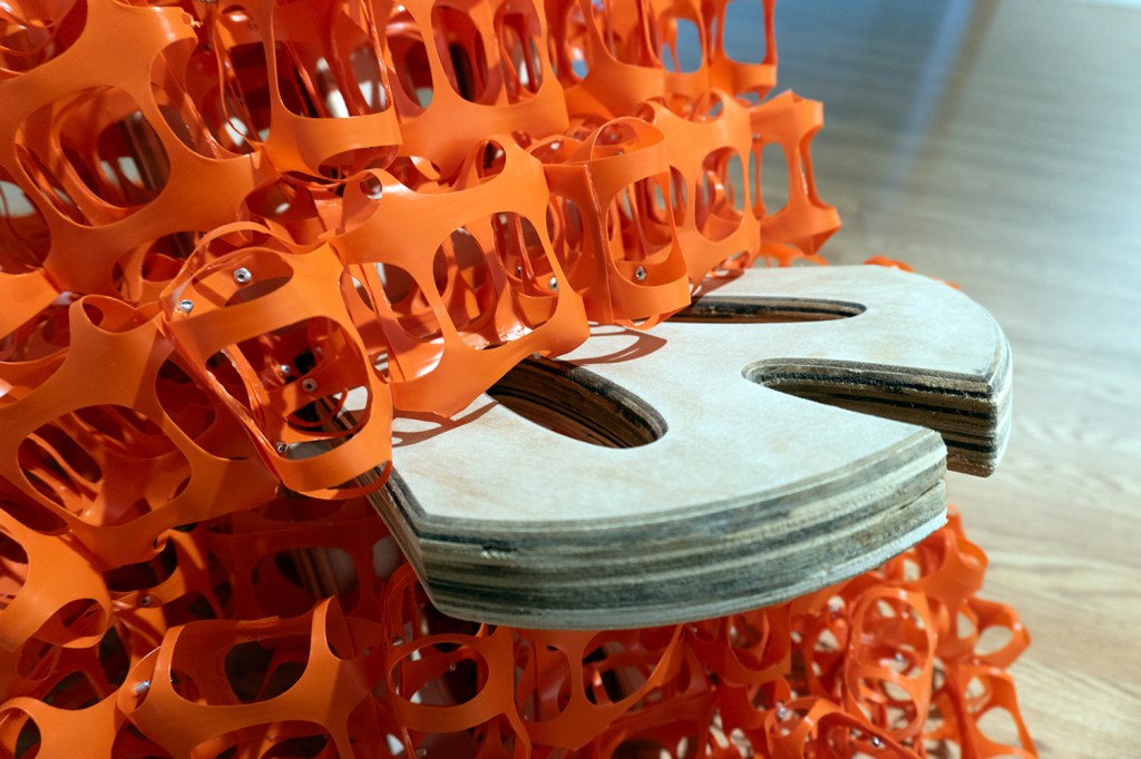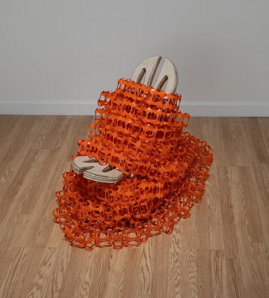 We’re Not in This Alone, 2025, construction barrier netting, plywood, pop-rivets, E6000, 28.5″ x 31″ x 36″